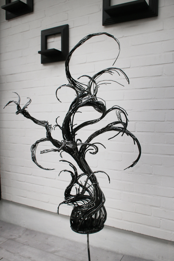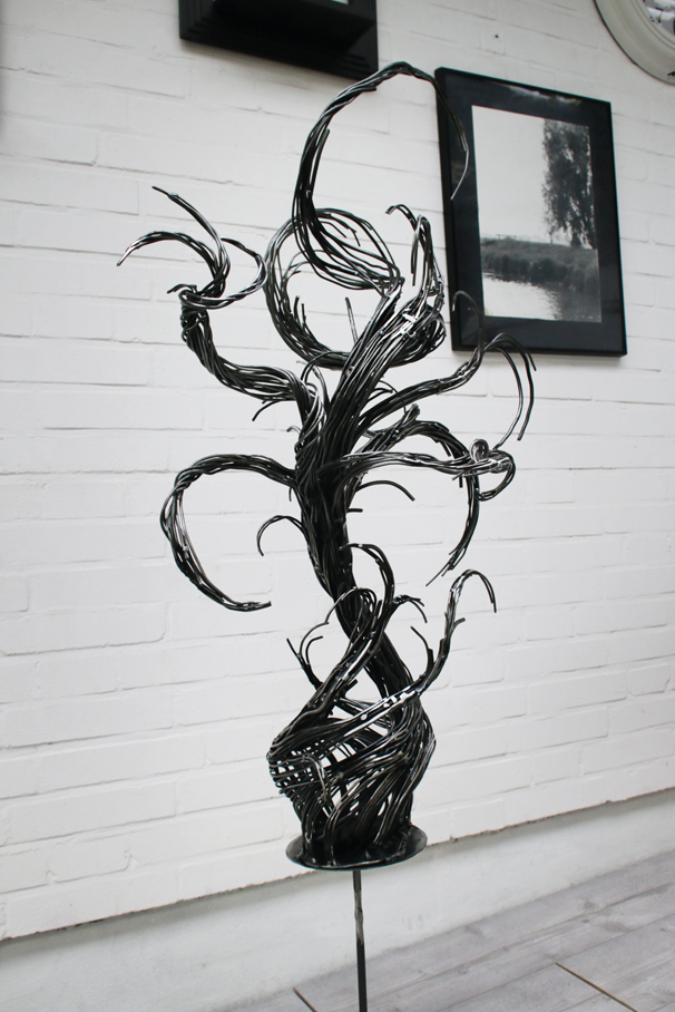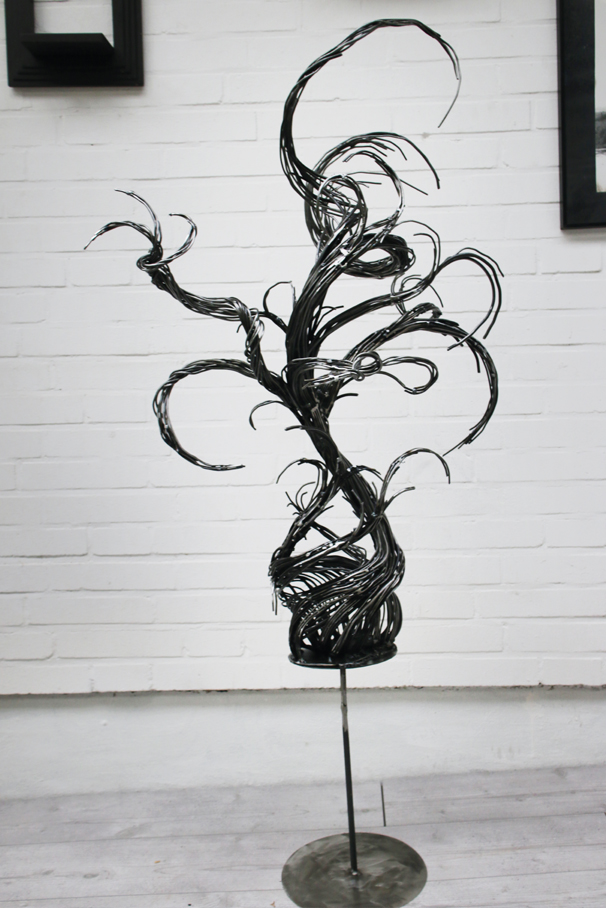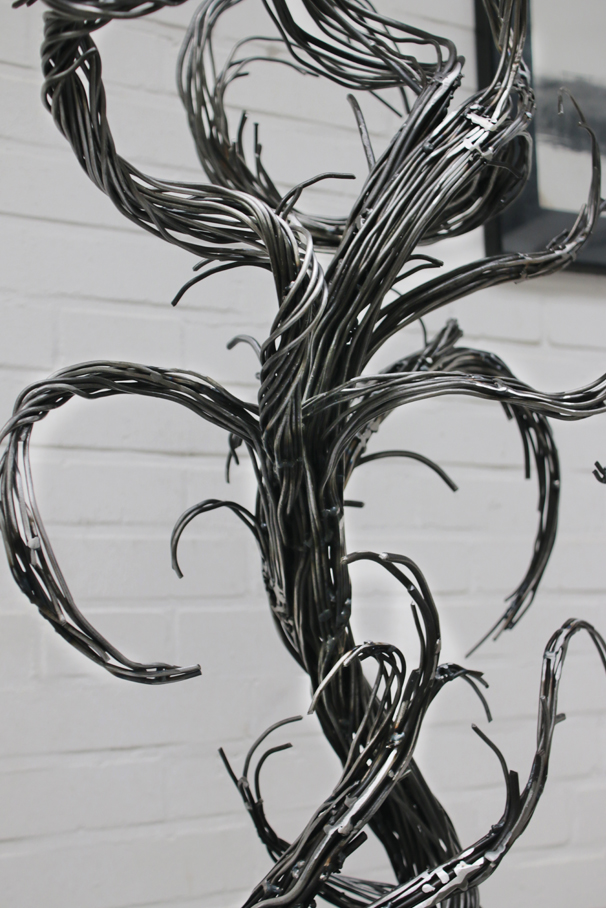 Aus einem Geflecht aus Eisendraht wächst eine Bewegung. Linien steigen auf, winden sich, kreisen. Die Inspiration für diese Figur entstand aus den Elementen Wasser und Feuer.